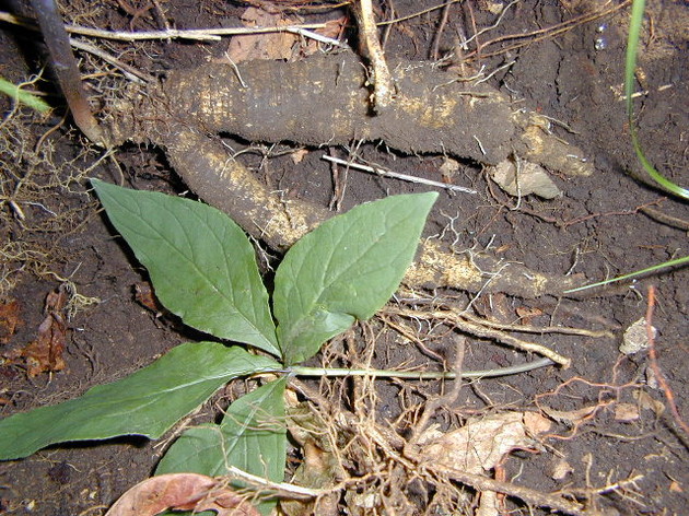 엄지손가락 만한 줄기 두개가 한뿌리에서 올라온 더덕 줄기였다.