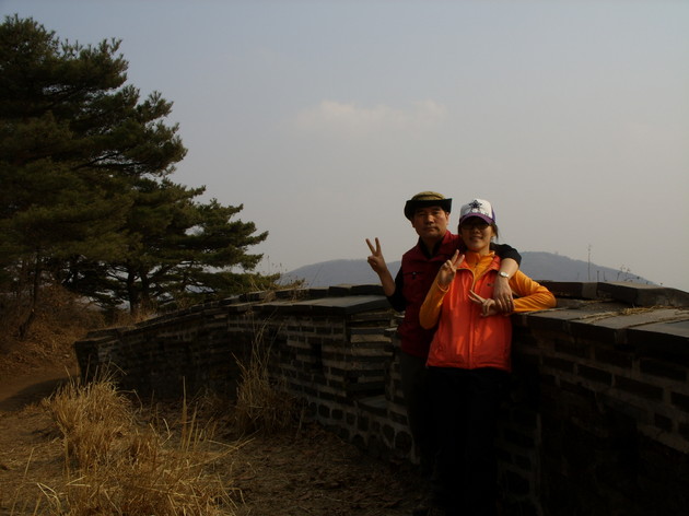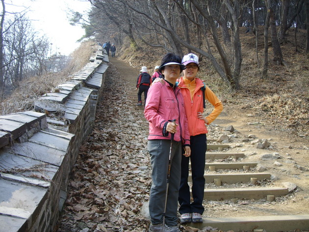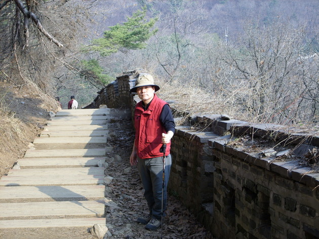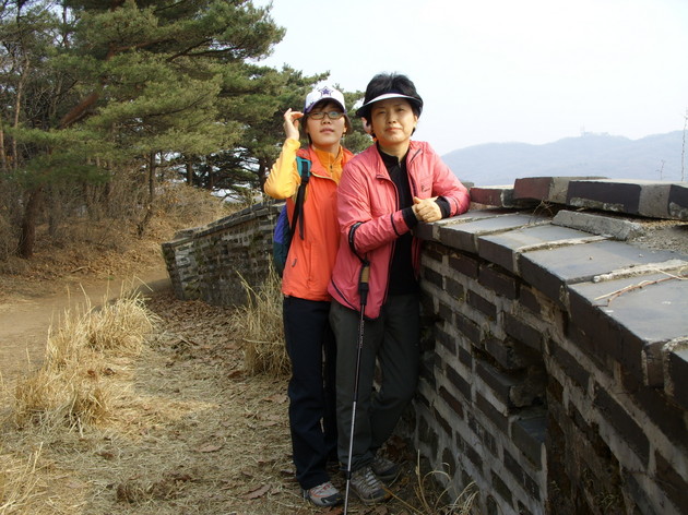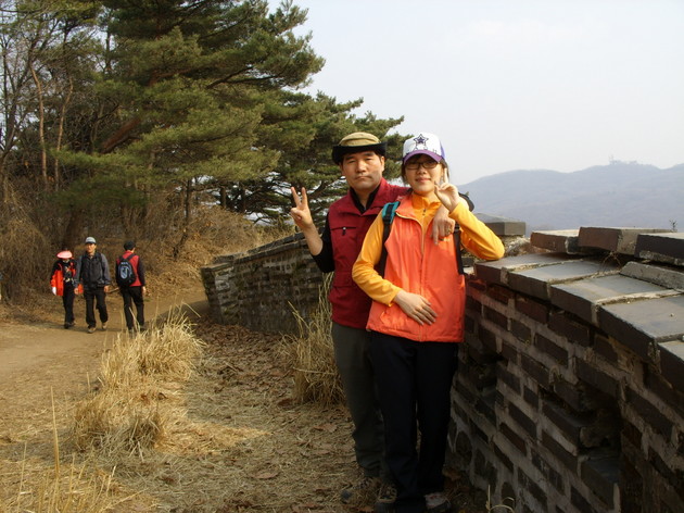 검은 성곽과 화려한 등산복이썩 잘어울려 보입니다.